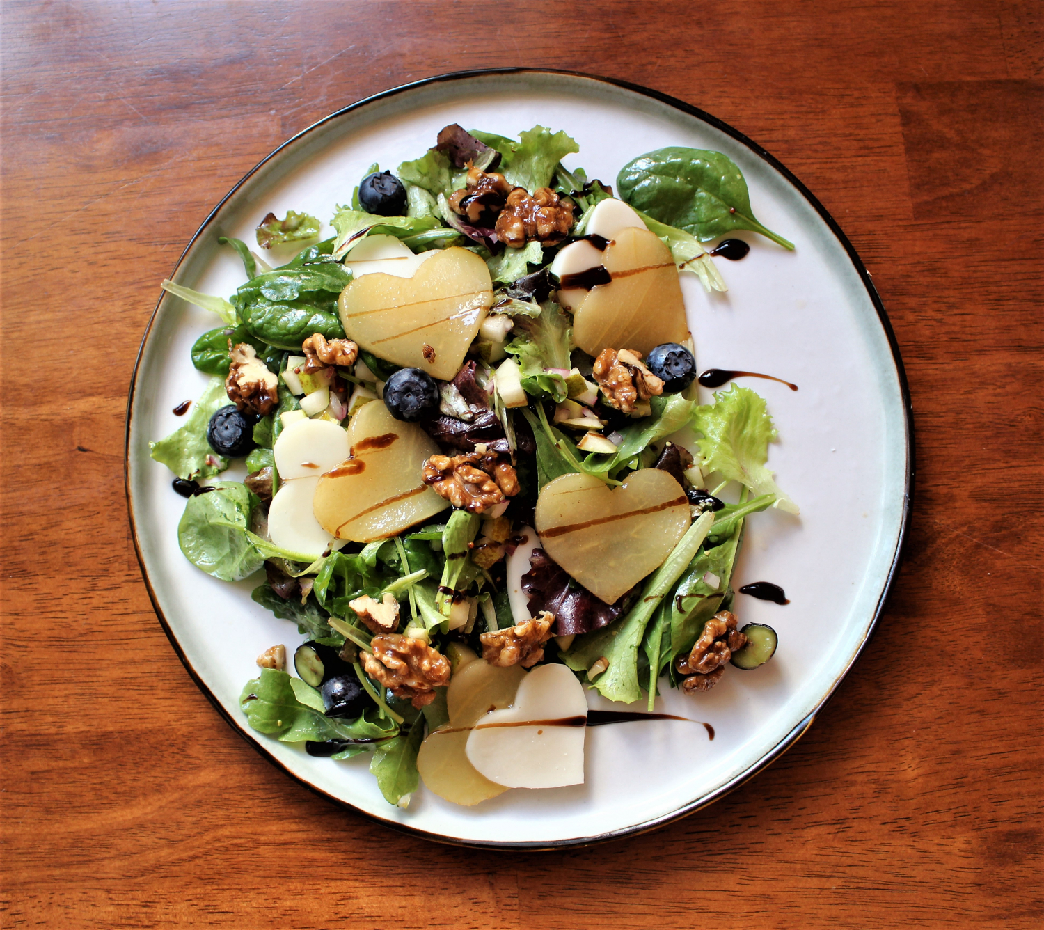 - Kārtojiet uz šķīvja spinātu lapas, tām pa virsu lieciet sirsniņās sagrieztos bumbierus un kazas sieru. Pārlejiet ar mērci, virsū uzberiet drupinātus valriekstus un pasniedziet!
