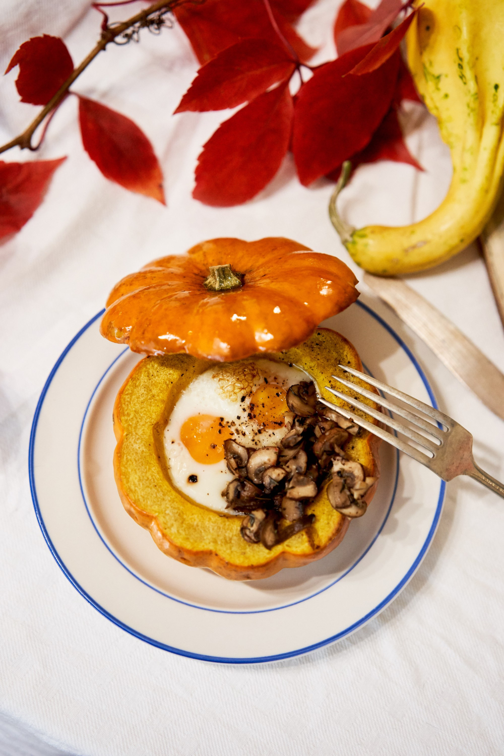 - Ķirbja vidū iesit divas jēlas olas, pārkaisi tās ar sāli un pipariem.