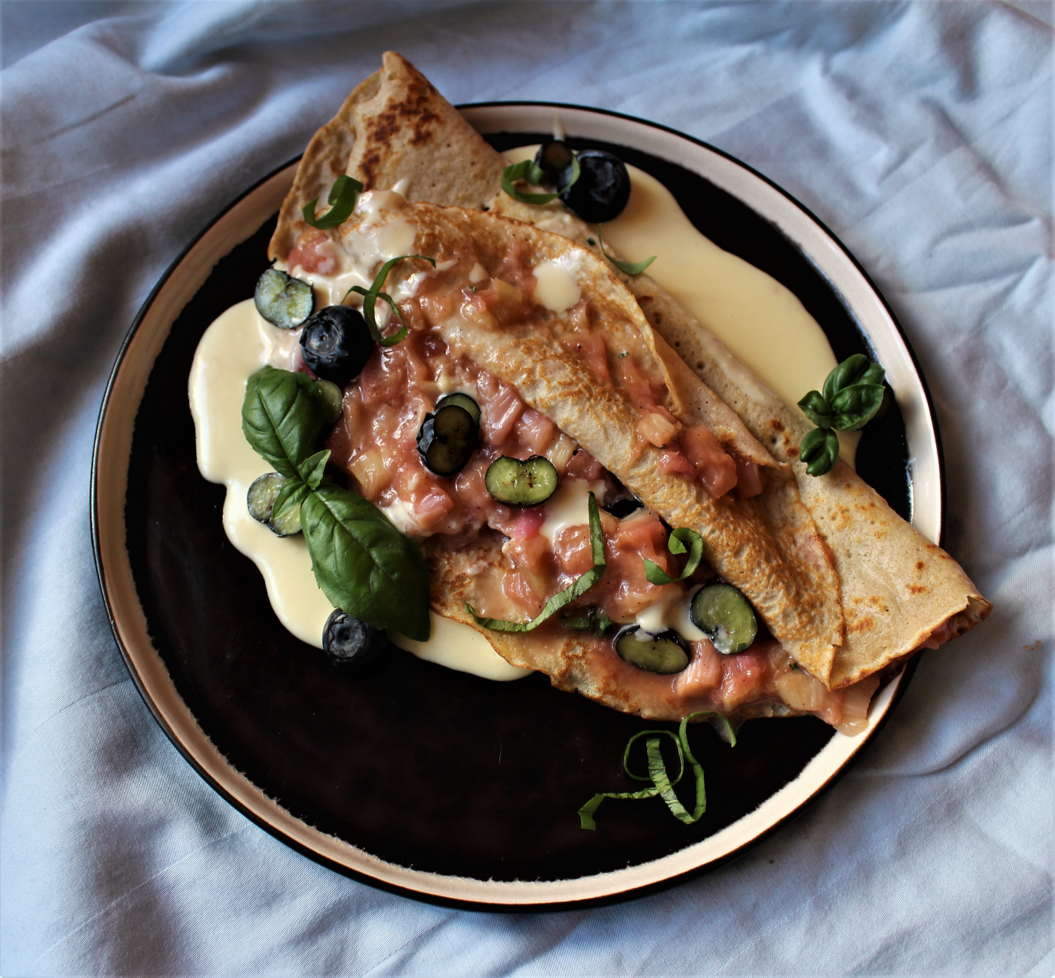 - Pildiet pankūkas ar rabarberu masu, salokiet un pasniedziet, pārlejot ar šokolādes mērci un rotājot ar zemenēm un piparmētrām.