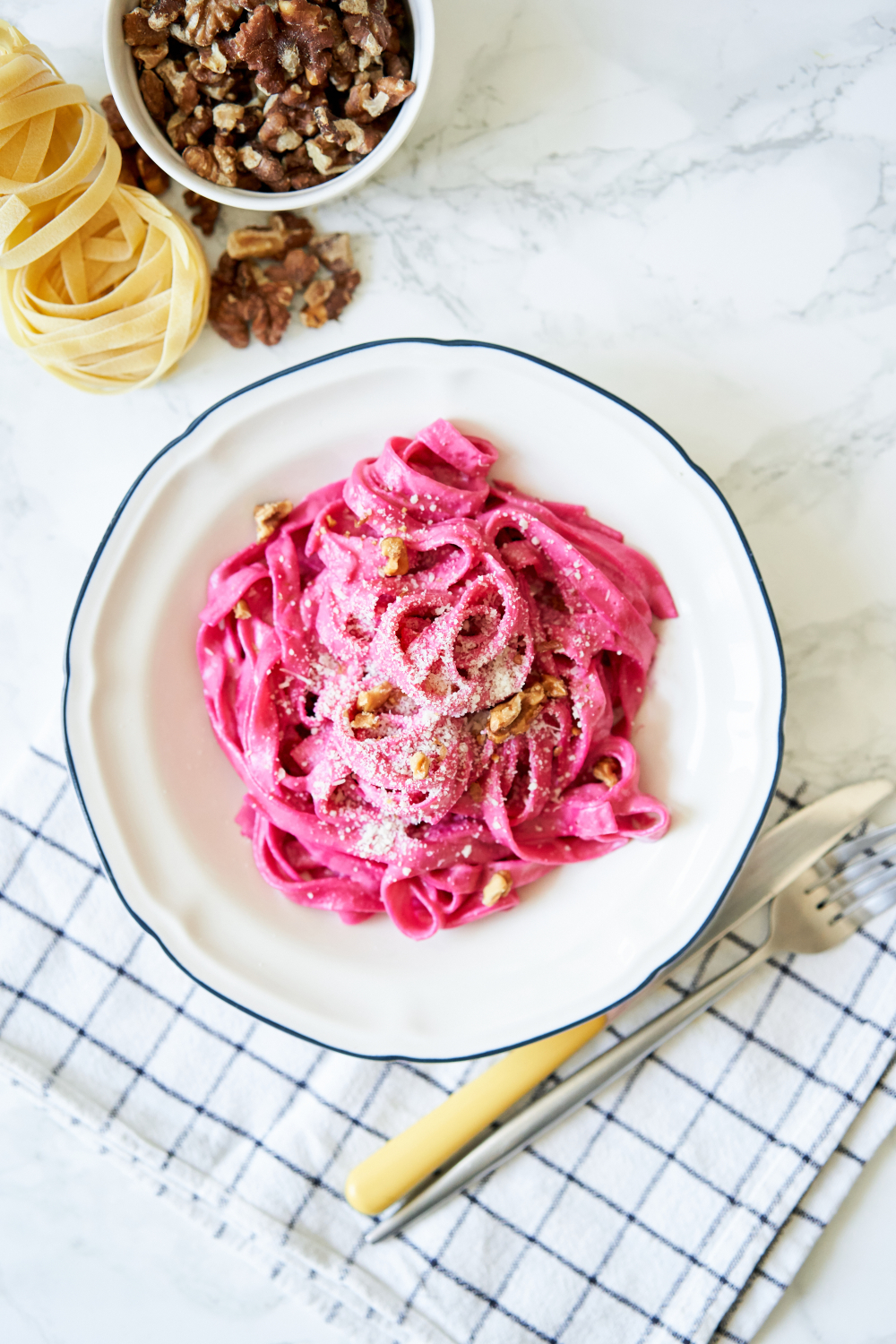 - Blenderī liec kazas sieru, gabalos sagrieztu bieti, olīveļļu, piparus, timiānu, 30 g valriekstu un pusi no ūdens, kurā vārījās pasta.