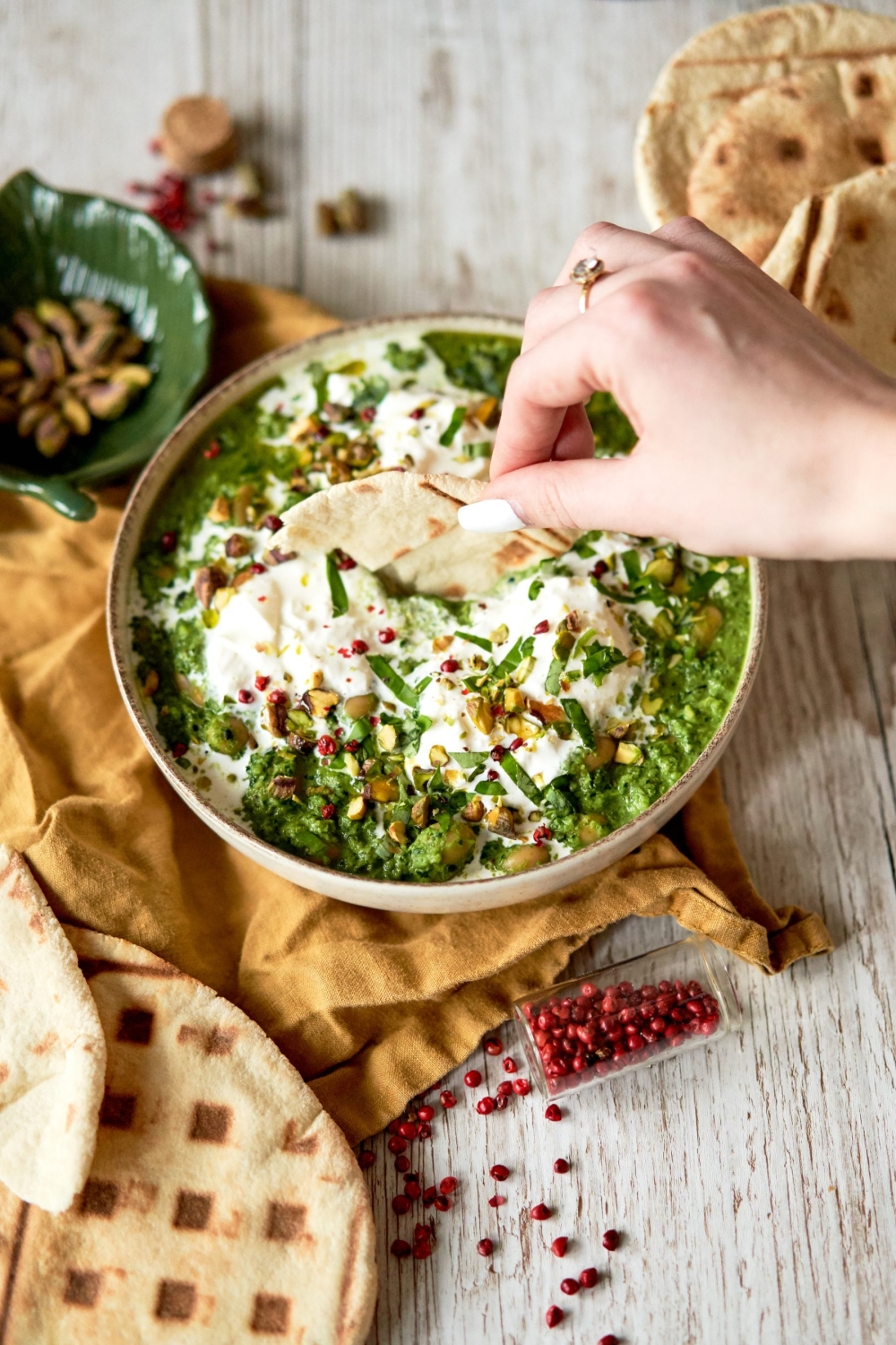 - Pasniedz kopā ar pitas šķēli rotājot ar buratas siera piciņām, bazilika lapām, kapātām pistācijām un rozā pipariem, aplejot ar nedaudz olīveļļas.